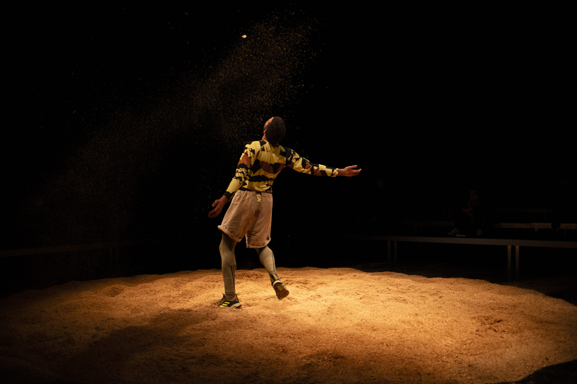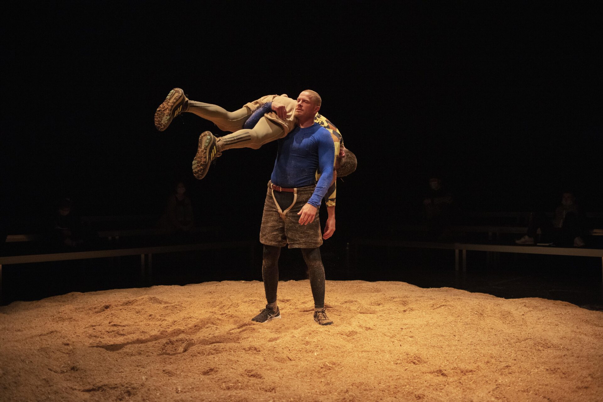 Der Duft von frischen Holzspänen, die zu einer kreisrunden Fläche aufgeschüttet sind, durchzieht den Theatersaal. Zwei kräftig gebaute Männer umkreisen sich gegenseitig und versuchen, einander zu Fall zu bringen. Unmerklich entsteht aus dem Duell zweier Schwinger ein Pas de deux im Sägemehl.