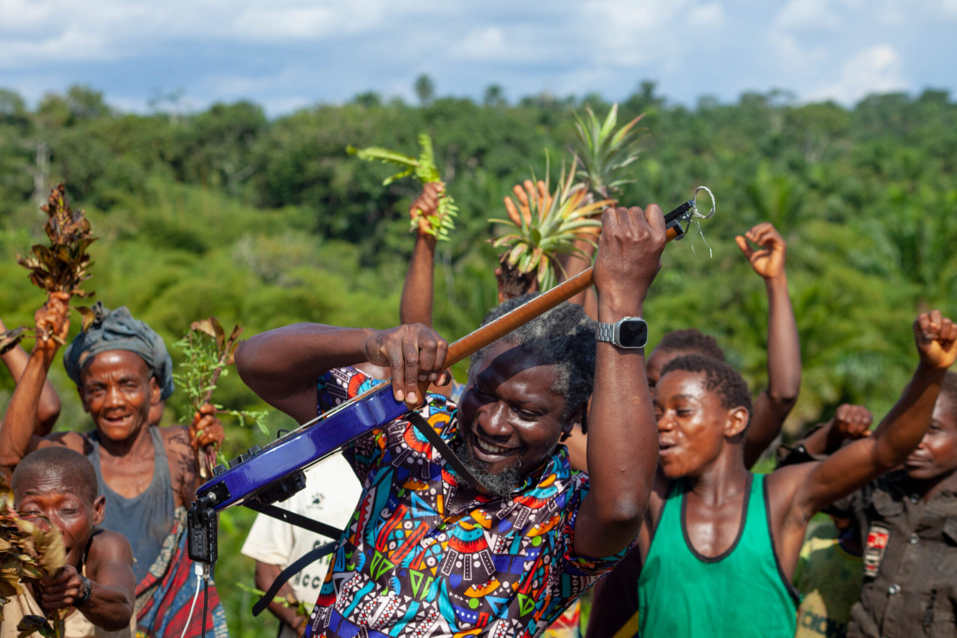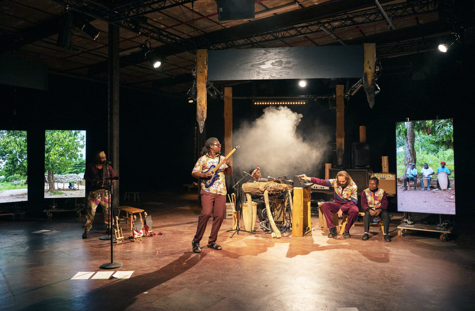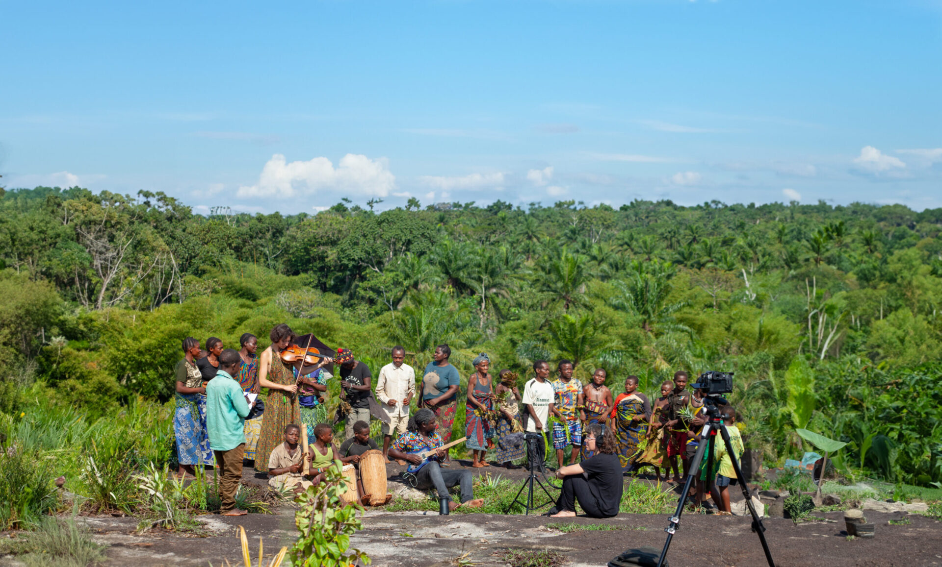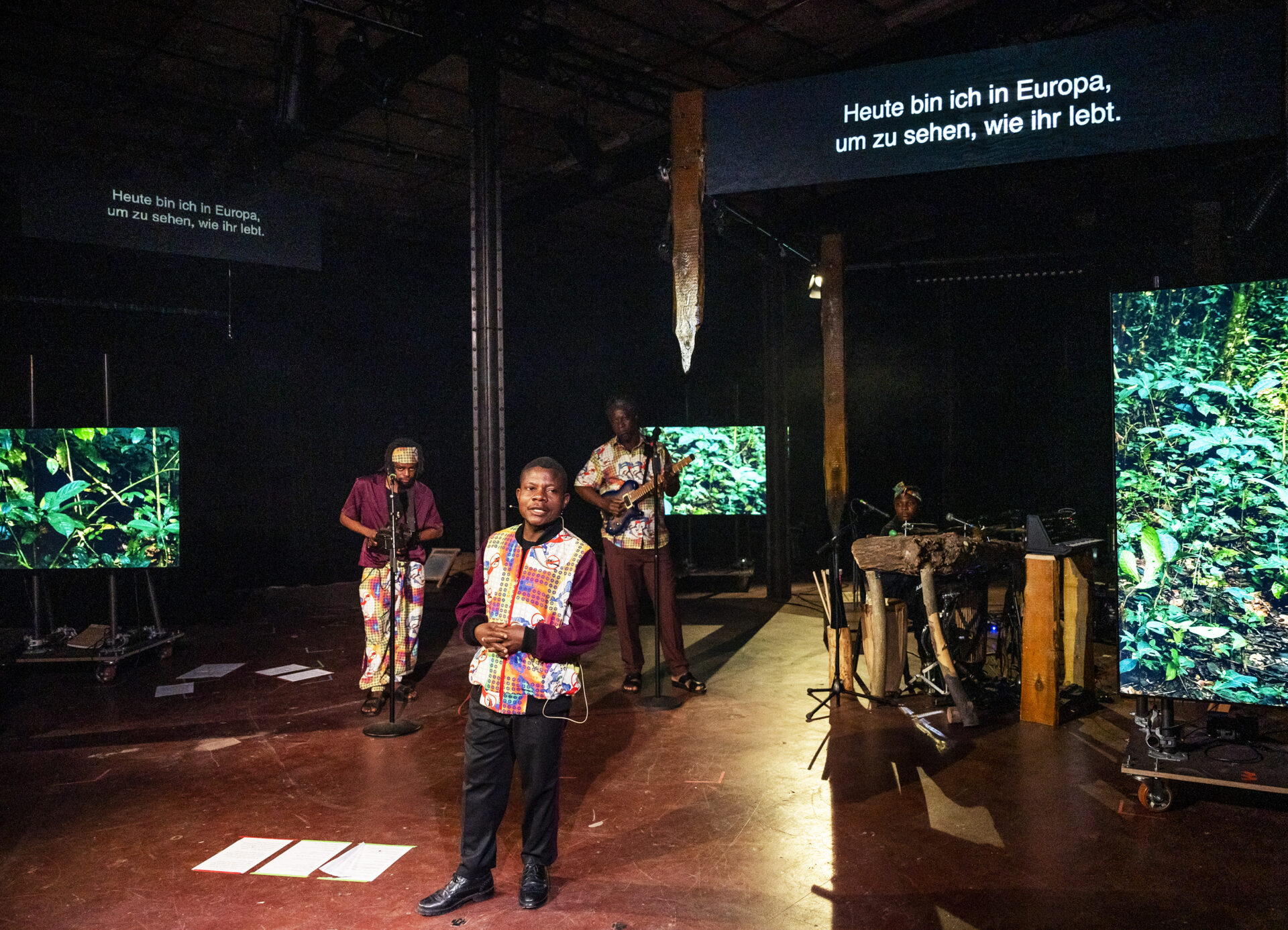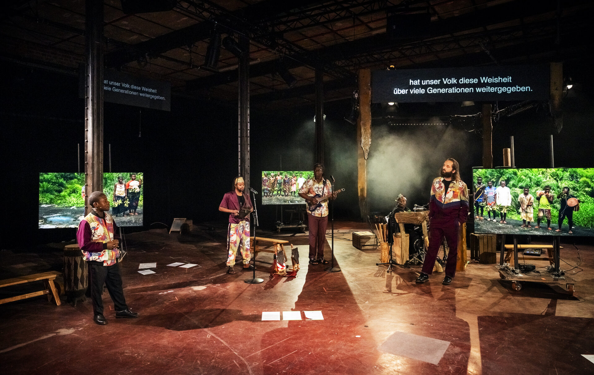 Gemeinsam mit lokalen Bauern und der Mbuti-Gemeinde in Bagoia, mit denen sie schon für ihr letztes Stück The Ghosts Are Returning zusammengearbeitet haben, diskutieren und singen die Performer:innen und Musiker:innen der GROUP50:50 darüber, was wir von unseren Vorfahren geerbt haben und was wir den zukünftigen Generationen hinterlassen werden. Im Dialog mit der traditionellen Musik der Region schaffen sie eine transnationale Zeremonie, ein ritueller Versuch über die Bedeutung des Waldes für das Schicksal der Weltbevölkerung.