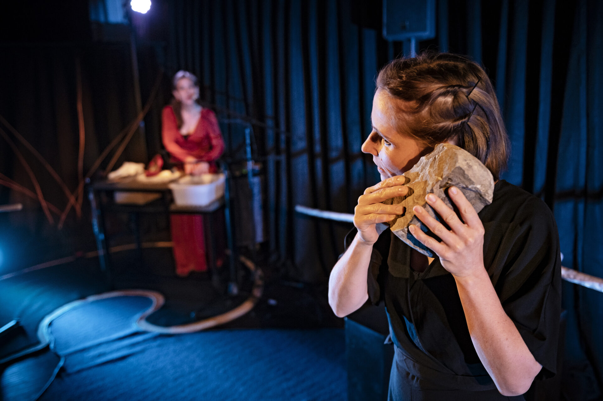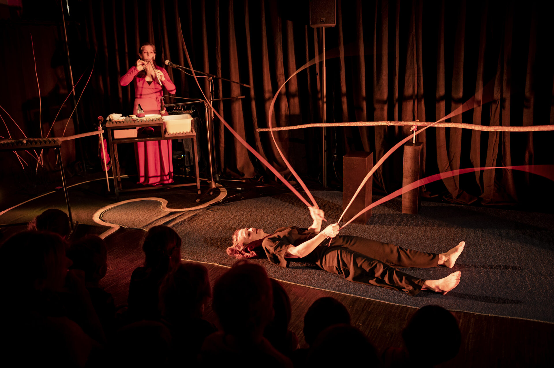 In «klAnK» erforschen eine Figurenspielerin und eine Musikerin den Klang der Dinge und machen sich – getreu dem Motto von John Cage «Alles, was wir tun, ist Musik» – auf die Suche nach ihrem eigenen «Sound». Das Auge hilft dem Ohr, aufmerksam zu bleiben und in die Tiefe zu horchen.