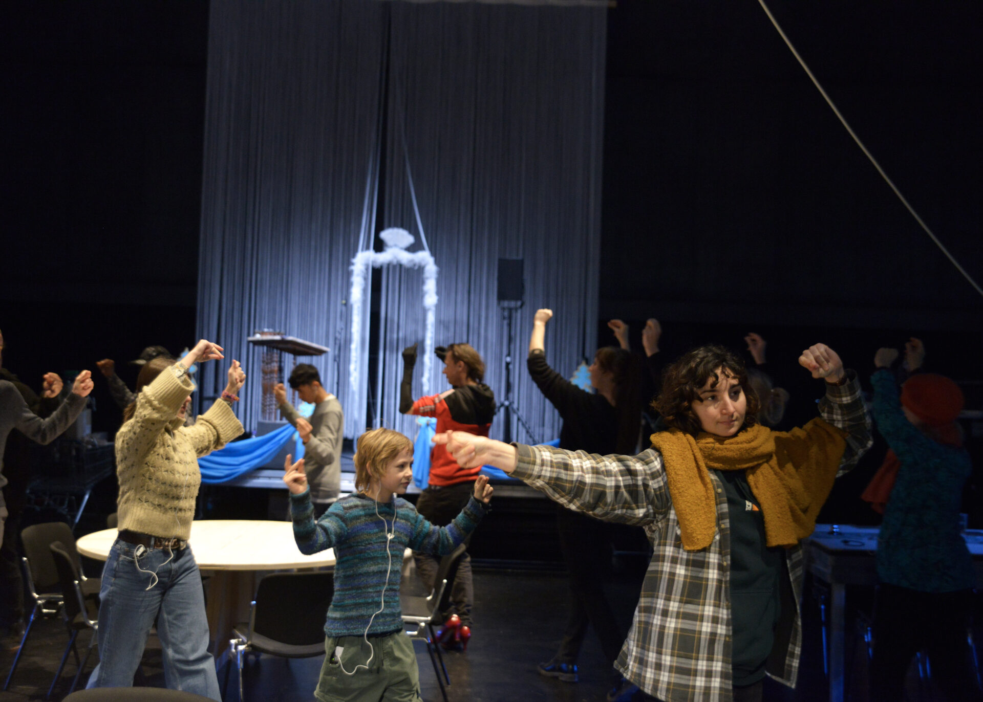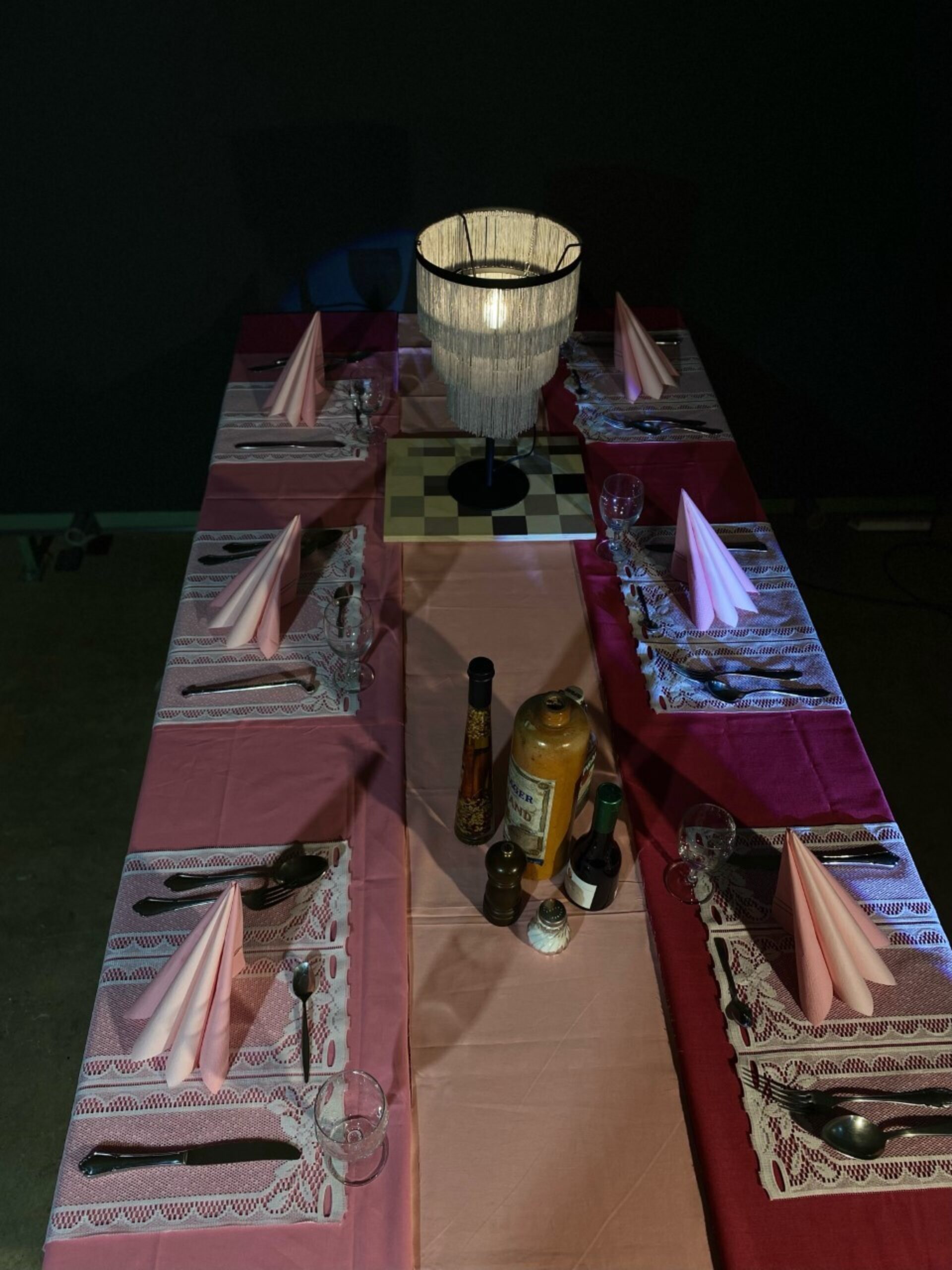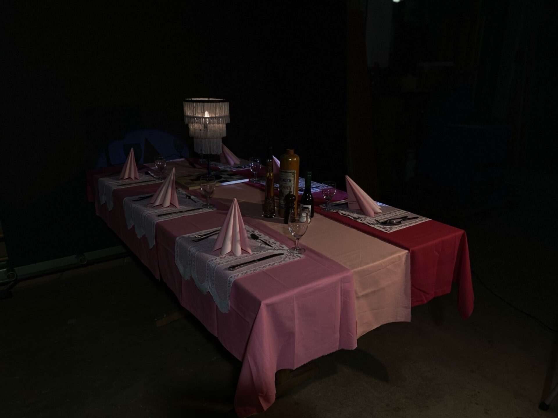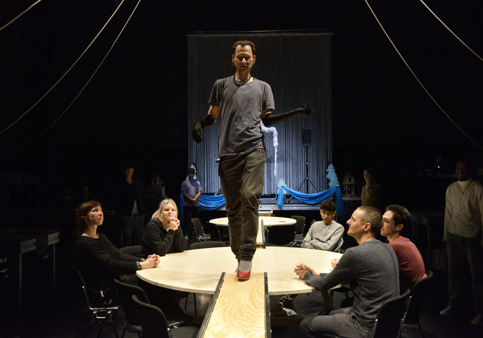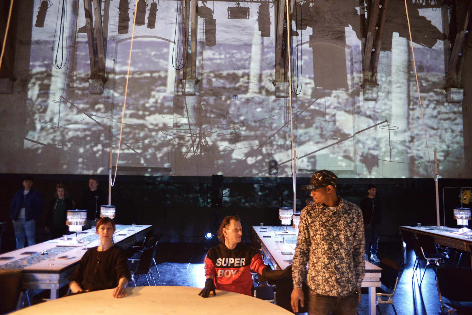 Zu einer angenehmen Hintergrundmusik betritt das Publikum den Saal. Es entdeckt einen einladenden Raum mit Tischen und Bänken, eine Ausstattung, die vielleicht an eine Firmenfeier oder eine Gala zum Jahresende erinnert. Die Zuschauer:innen werden alsbald von charmanten und perfekt organisierten Mitgliedern des Empfangsteams betreut, welche sie zu ihren Plätzen führen und sich um sie kümmern.