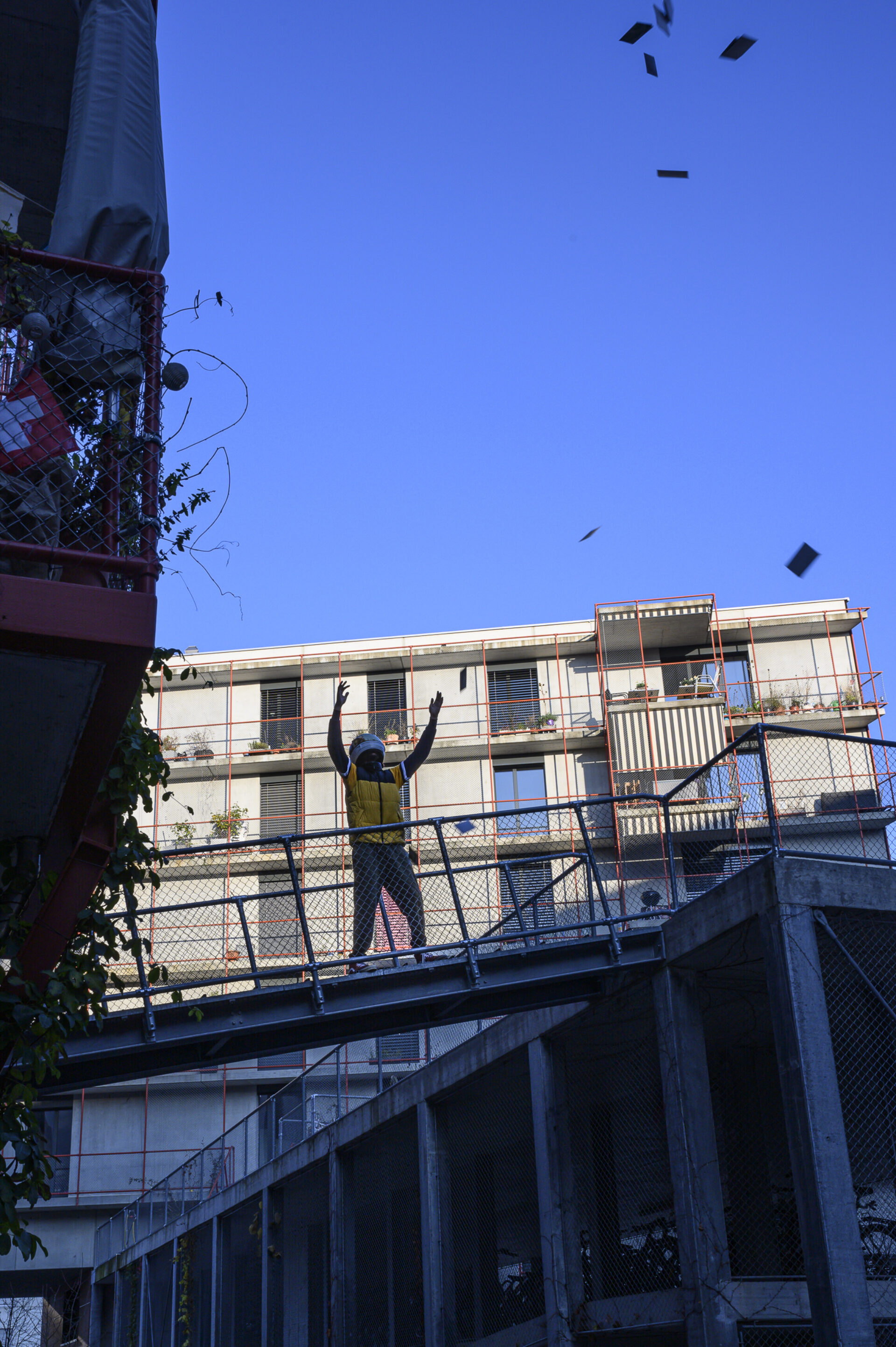Alle Zuschauer:innen absolvieren auf einem Parkour durch das Quartier zusammen mit Viktor eine Ausbildung zu Astronaut:innen. Wer kennt das Gefühl vom Fliegen? Wie lange kann man ohne Sauerstoff sein? Es wird geturnt, gerannt und sogar der Kopfstand probiert. An den verschiedenen Posten des Rundgangs diskutiert man miteinander, warum es schwarze Löcher gibt und wie lange ein Ballon braucht, bis er beim Mond ist. Aber auch die Konflikte des Stücks kommen zur Sprache: Hat Zeynep recht, weil sie sich von Silvia im Stich gelassen fühlt? Oder hat Silvia recht, dass man auch befreundet sein kann, wenn man nicht am selben Ort lebt?