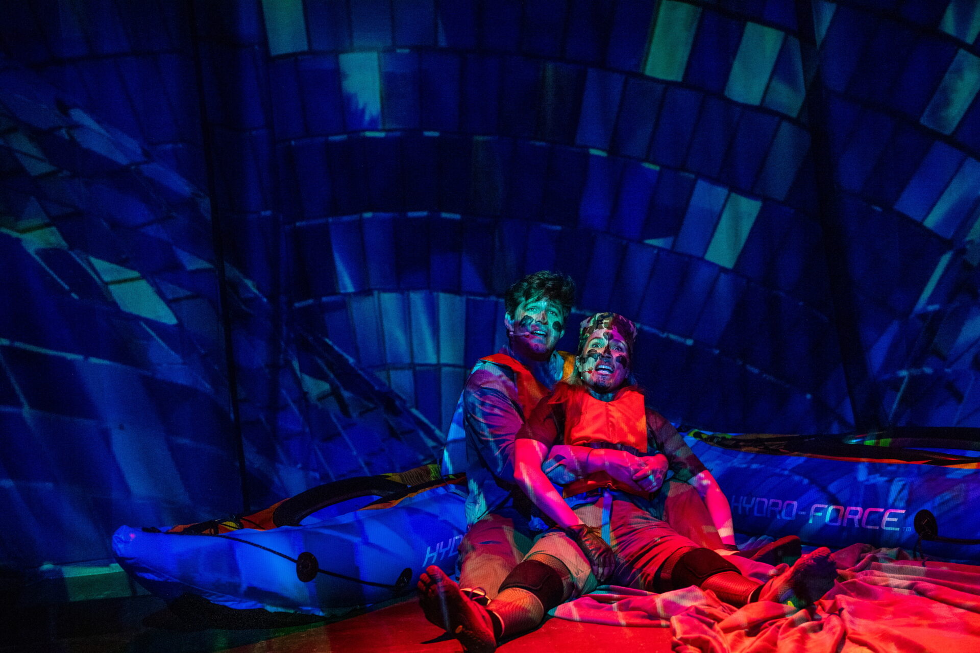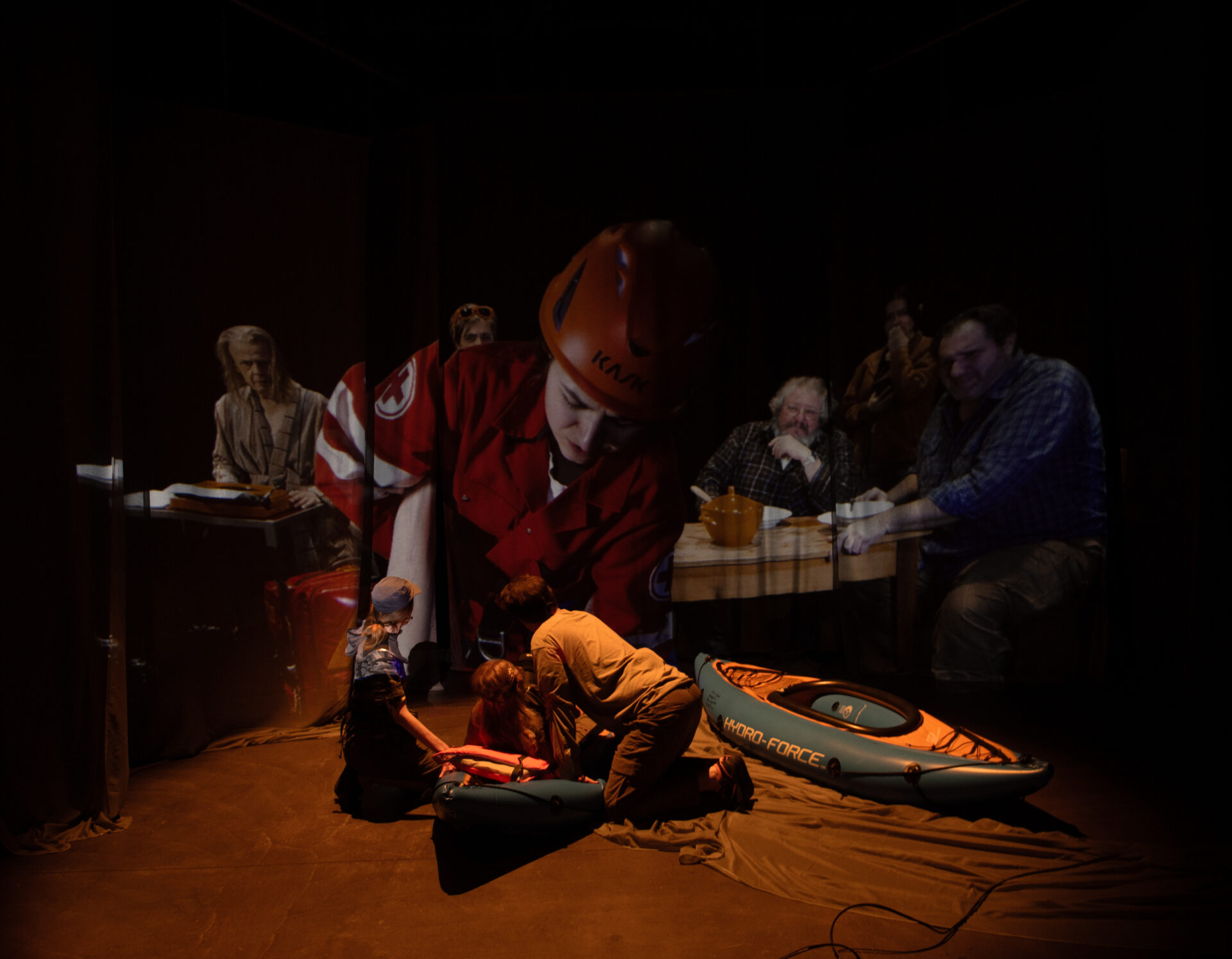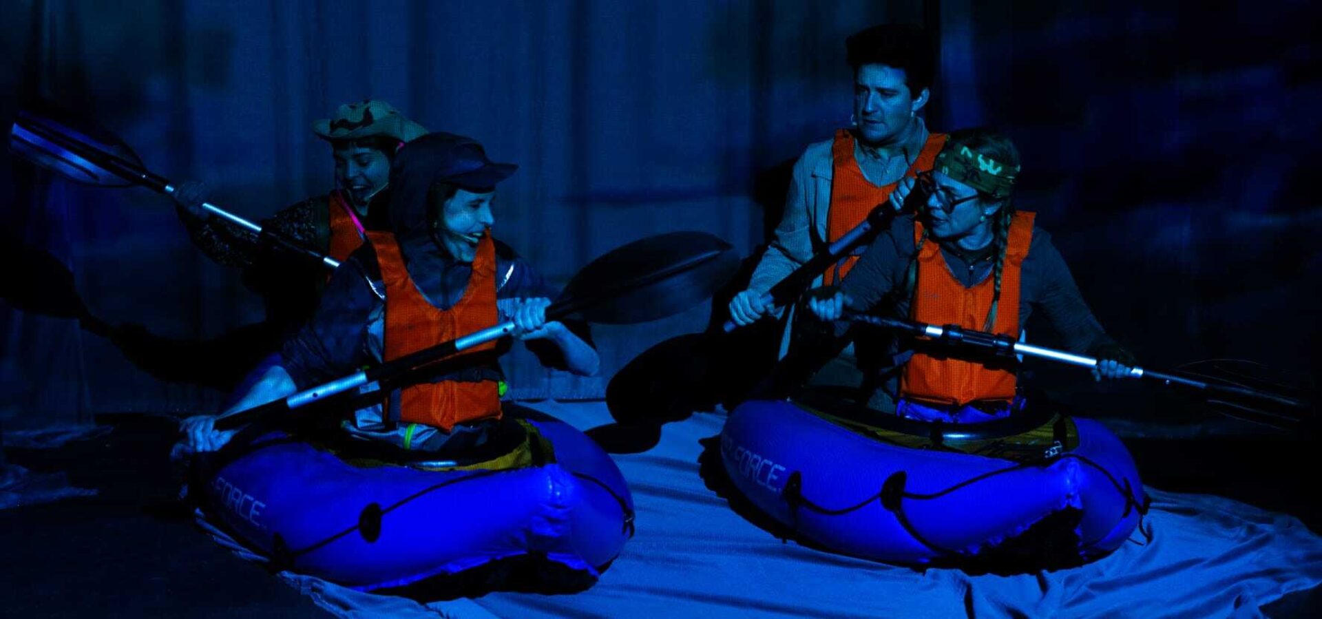 Vier Stadtmenschen wagen ein Kajak-Abenteuer durch eine wilde Schlucht – ein Survival-Trip, aus dem schnell ein Albtraum wird. Der Fluss ist nicht ihr einziger Gegner. Unerwartet treffen sie auf Einheimische, deren unkonventionelle Lebensweise sich den gängigen Klischees widersetzt. Ihre eigene Selbstüberschätzung bringt die Gruppe immer näher an die Schwelle zwischen Realität und Wahn. Auf der Bühne treffen die vier Hauptfiguren auf 16 ambitionierte Laienschauspieler:innen, die per Videoprojektion auftreten. Begleitet von Live-Musik verwandelt sich die Schlucht in einen mythischen und unheimlichen Ort, an dem die Grenzen verschwimmen. Barbara Terpoorten als Regisseurin und Schauspielerin lässt mit ihrem Team in dieser Walliser Komödie Stadt und Land aufeinanderprallen – skurril, wild, lustig und erschreckend aktuell.