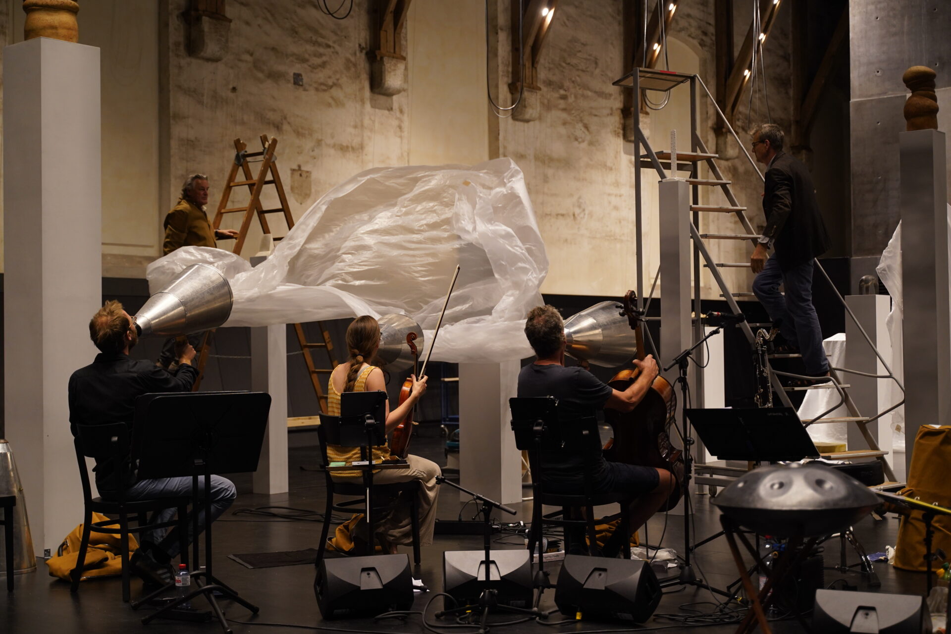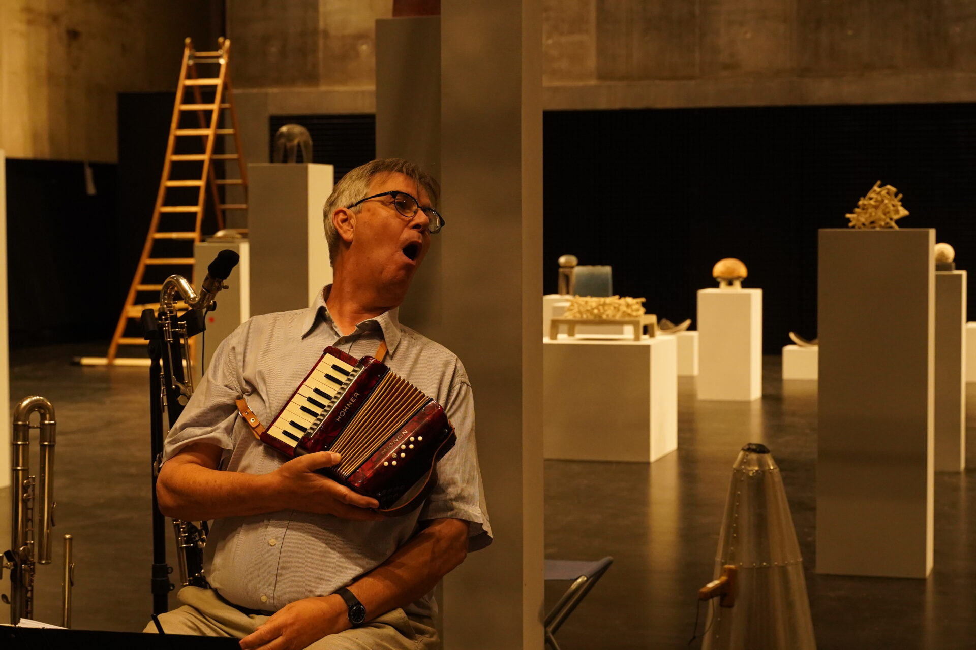 Es wird gesägt, gehämmert, fotografiert und dokumentiert. Ein Wald von Sockeln steht bereit, Kunstobjekte zu empfangen, flirrende und liedhafte Musik verdichtet die Optik einer Ausstellung, die im Entstehen begriffen ist und wiederum den Raum für die Konzerte bildet.