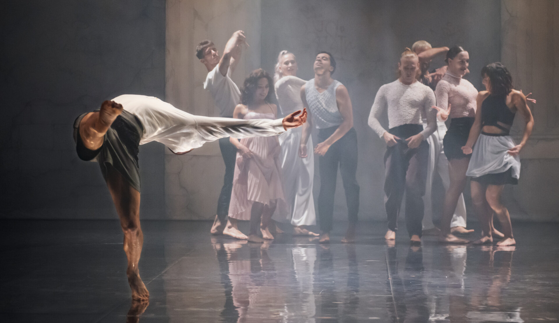 Nicht weit entfernt von Isolation, sozialen Spannungen und einer bedrückenden Düsternis, fragt das Stück, was passiert, wenn der Körper ausbricht: Auf der Bühne greift ein Fieber um sich, ein Schauer legt sich allmählich über die neunköpfige Gruppe, und schliesslich die Erlösung: «Le Grand Bal» ist eine Zeremonie der Befreiung. Die mitreissende Choreografie versetzt die Tänzer:innen in Trance und schwappt über: ein kollektives Rauscherlebnis als Höhepunkt einer Revolte, die weit über den Bühnenrand hinausgeht.